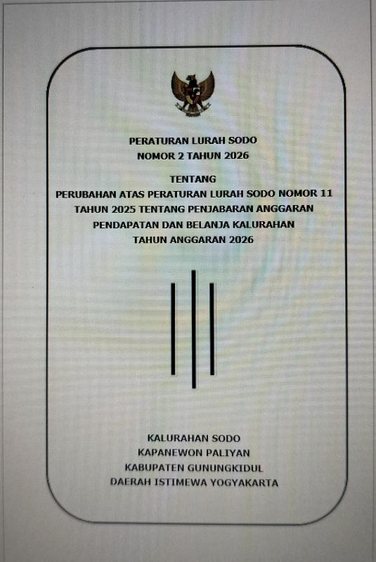 Berdasarkan Peraturan Bupati Gunungkidul Nomor 61 Tahun 2018 tentang Pedoman Pengelolaan Keuangan Desa sebagaimana telah diubah dengan Peraturan Bupati Gunungkidul Nomor 51 Tahun 2019 tentang Perubahan atas Peraturan Bupati Gunungkidul Nomor 61 Tahun 2018 tentang Pedoman Pengelolaan Keuangan Desa serta Surat Edaran Pemerintah Kabupaten Gunungkidul Nomor B/100.3.8.1/263/2026 tentang Perubahan APB Kalurahan Tahun Anggaran 2026 untuk menyesuaikan Kebijakan Pemerintah, Pemerintah Kalurahan Sodo telah menyusun Peraturan Lurah Sodo tentang Perubahan Penjabaran APB Kalurahan Tahun Anggaran 2026.